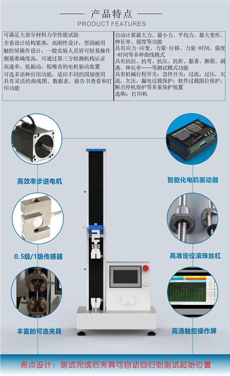 YTN-D系列單柱拉力試驗機采用單柱結構,結構牢固,操作方便,維護簡單。設備配備了多重保護裝置,包括機械行程開關、急停開關、過流、過壓、欠流、欠壓、漏電過載保護等,確保設備在運行過程中的安全性。此外,設備還具有測試完成后自動返回至測試起始位置的自動歸位功能,進一步提升了操作的便捷性。
